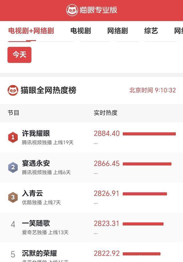截止10月14日上午9时10分,从“猫眼专业版”实时数据显示可知,当前热播电视剧中,网播热度最高的五部剧分别如下: 1、《许我耀眼》 主演:赵露思/陈伟霆/万鹏 剧情点评:看完了,服道化是真的用心,赵露思挺美的但是五官有种嘭起来的感觉,谁弄的…陈伟霆还是剧外比较帅,两个人演的都有点怪怪的。主体故事很难评,每一个攻略part都好老土,演讲环节太多,浩辰和女主认识很久吗,感情这么深?女主视角就是为了不伤害前夫私生子幼小的心灵所以和前夫保持联系,不恨都算她大度了还赶着去当后妈?还有金达那么大的集团医院找关系居然是于一鸣什么导师的什么同学这一层,然后男主妈这种富太人设还要和护工轮班?好歹多派几个人啊,整个剧就是一会装一会low。所以整体可看,到也只能当作下饭剧。